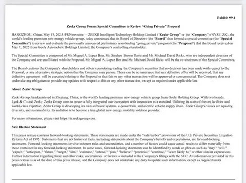 14 мая ZEEKR Group опубликовала объявление, в котором объявила о создании специального комитета для оценки предложения о приватизации, предложенного Geely Automobile.