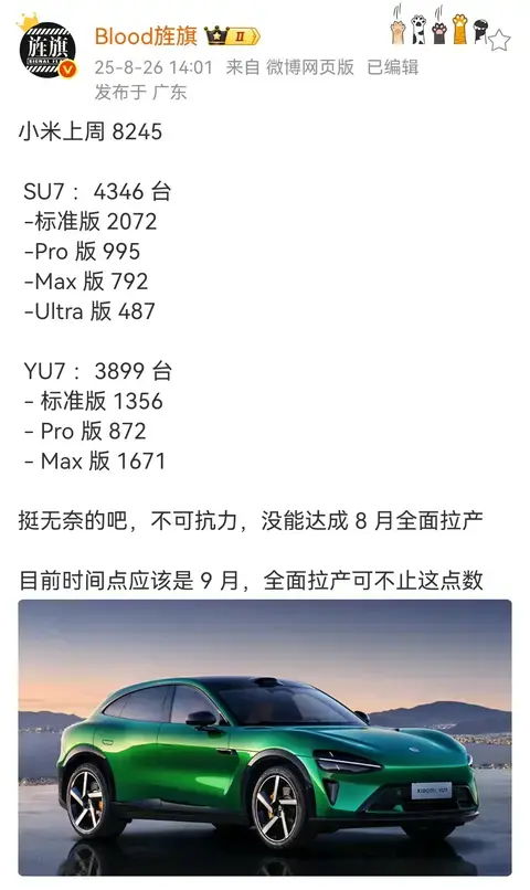 На прошлой неделе Xiaomi Auto поставила потребителям в общей сложности 8 245 автомобилей, в том числе 4 346 Xiaomi SU7 и 3 899 Xiaomi YU7.